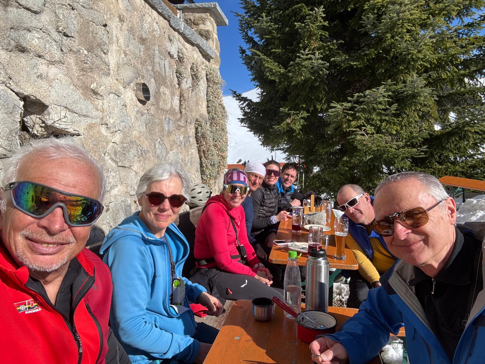 Donnerstag Tour zum Rauhkopf. Der Abstecher bei der Abfahrt zur Schönfeldhütte mit Apfelkuchen auf der Sonnenterrasse war ein weiterer Genuss bei diesem herrlichen Tourentag.